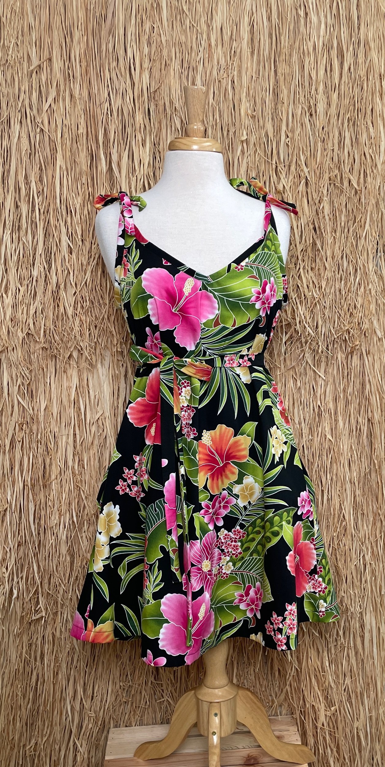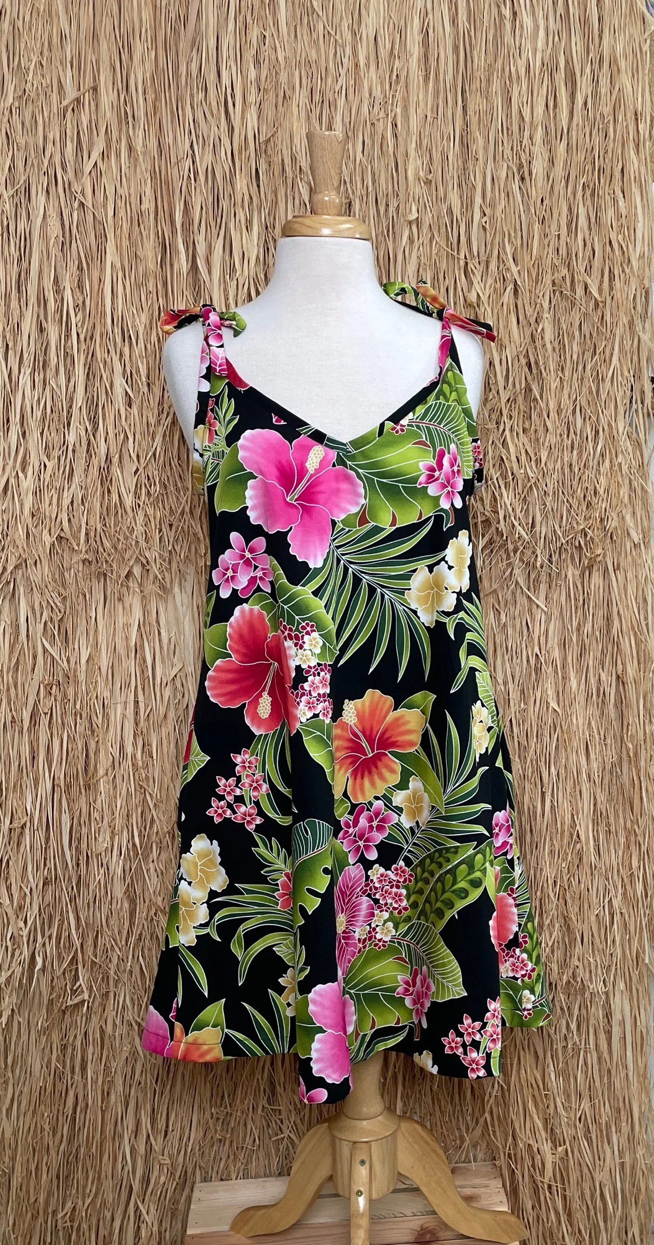 Ties at shoulders for adjustable neck line.